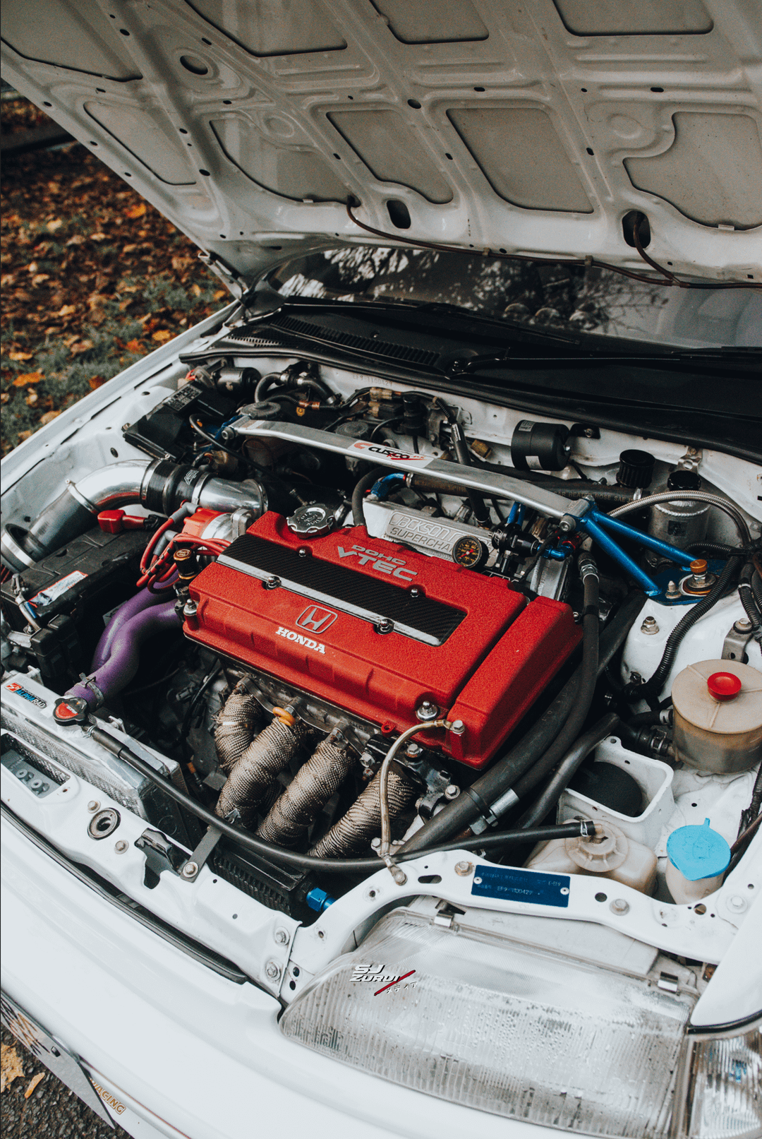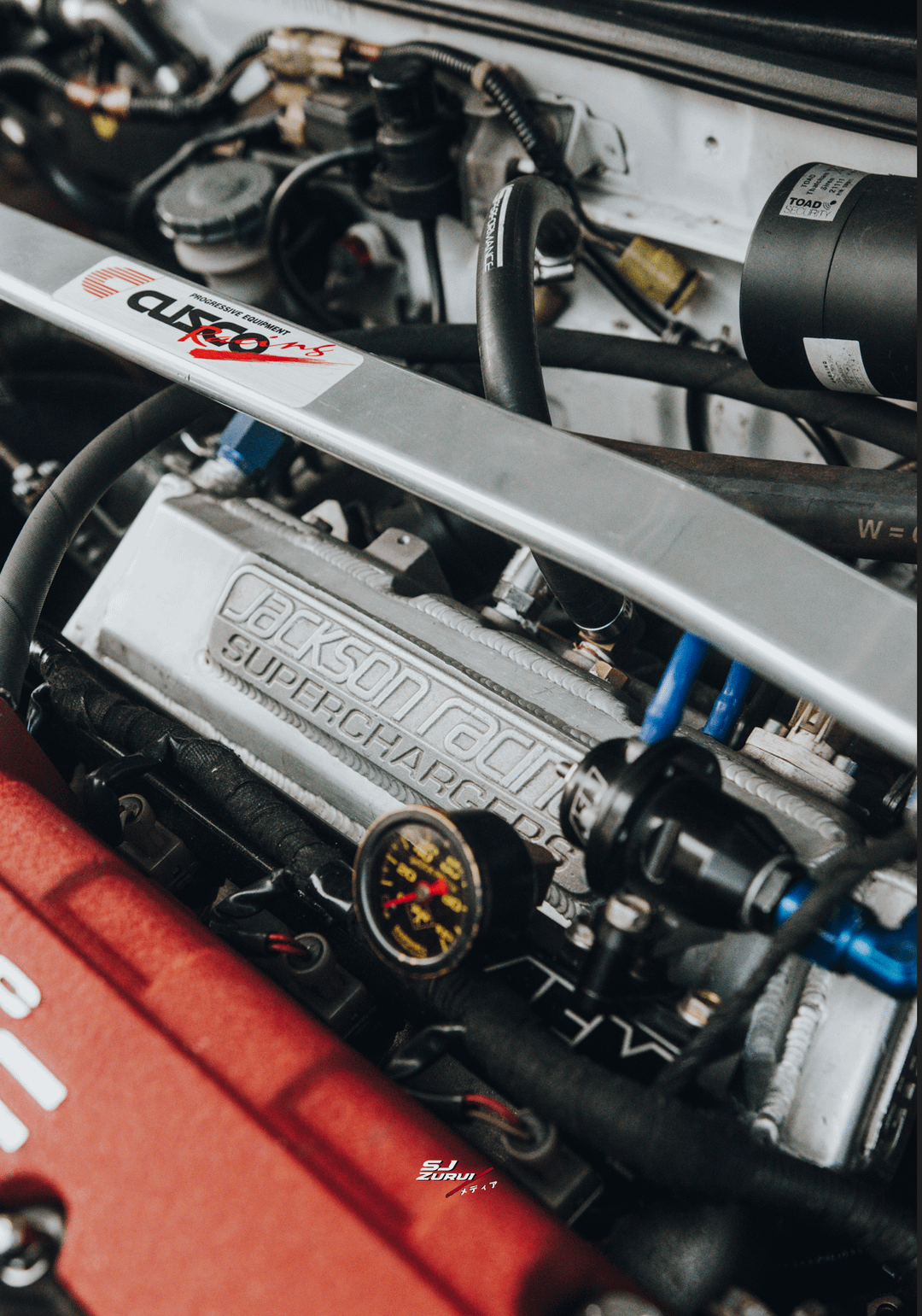 The car originally shipped with a b16, however now its retrofitted with a b18c6 supplemented with a hard to find Jackson racing supercharger, aem fuel rail/regulator, 4.2 snout pulley, skunk2 alpha TB, 550cc injectors, hondata s300v4, ek9 shafts all around and mocal oil cooler to keep the temps in line.