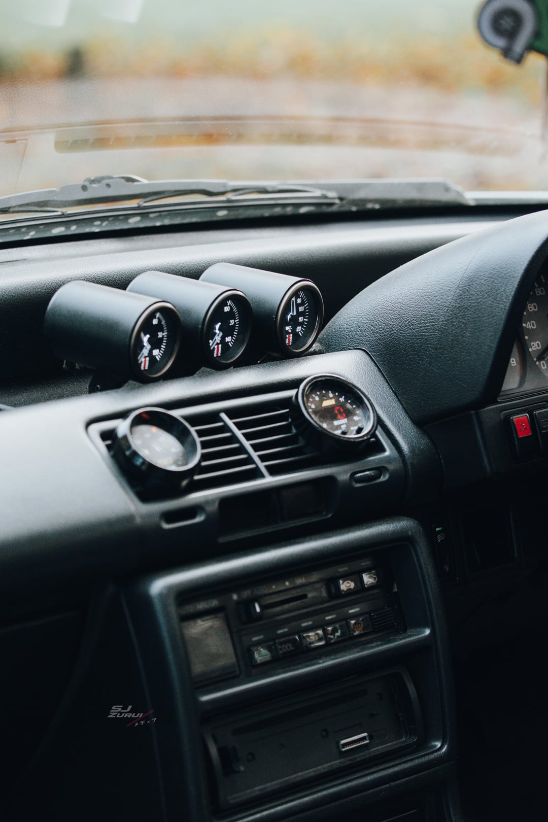 The front of the car is adorned with a J’s racing spoiler, rarity honda access fog lamps, a charge speed rear spoiler, access wind visors & sunroof visor, and a very kanjo inspired headlight delete for that cold air intake just hiding behind.