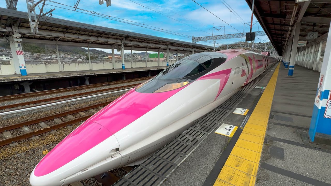This time, I traveled on the Hello Kitty Shinkansen from Osaka to Hiroshima. The interior of the train was decorated with Hello Kitty themes, and various merchandise was on sale. Please check it out in the video.