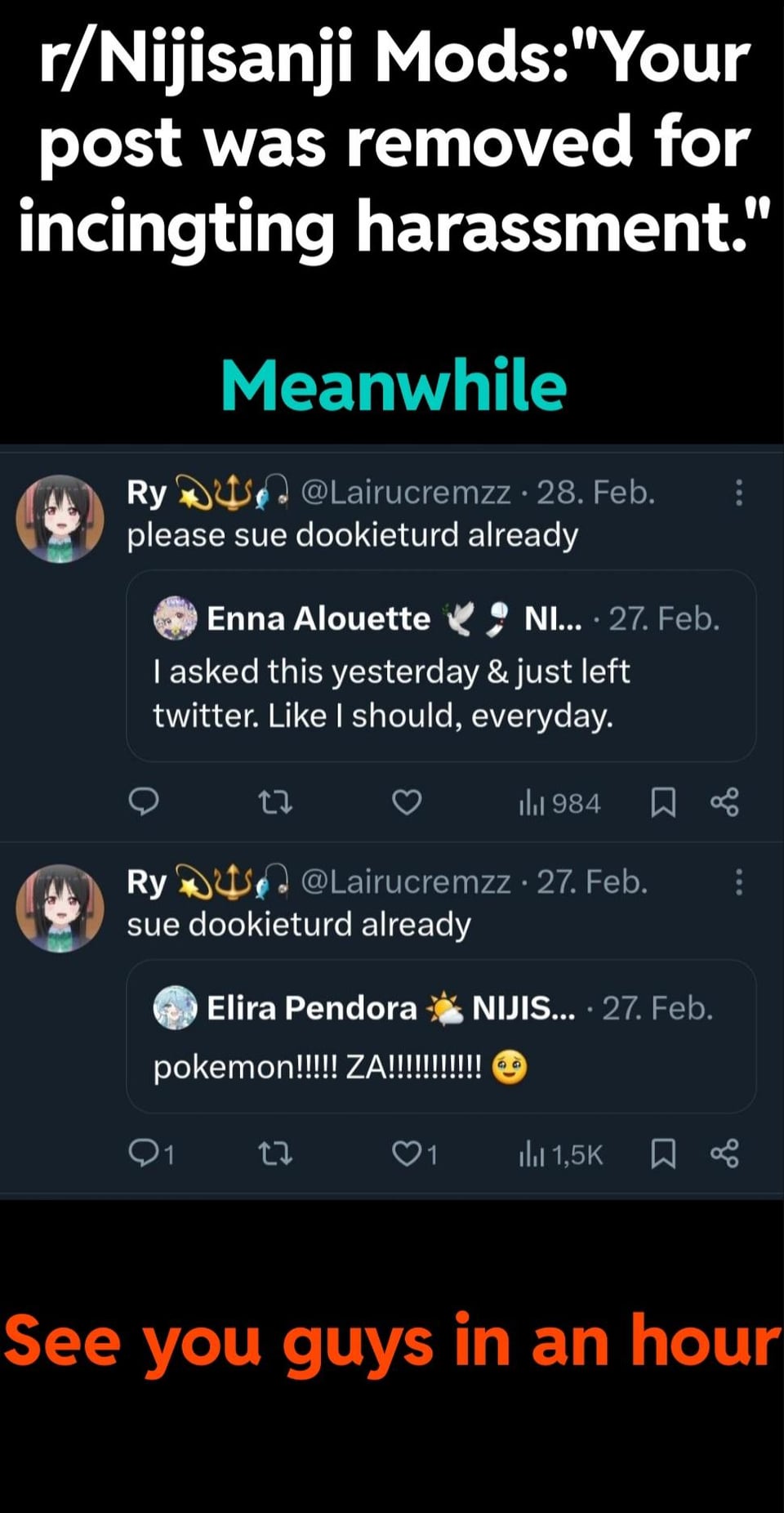 The lack of selfirony is… by alexslice nijisanji 3 Comments raydude888 2 years ago Dookieturd? Really, what are you, children? Scratch that, anyone who uses dookie as an insult unironically is definitely a child. kengenerals 2 years ago is that a mod Jumbolaya315 2 years ago Sueing a suicide victim that they bully eh, surely it couldnt look worse than that Write A CommentYou must be logged in to post a comment.