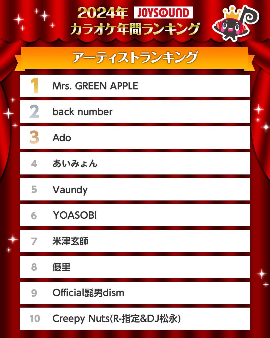 Joysound 2024 Top 10 Karaoke Artist Ranking by Substantial_Writer31 J-POPJ-Pop Music Write A CommentYou must be logged in to post a comment.