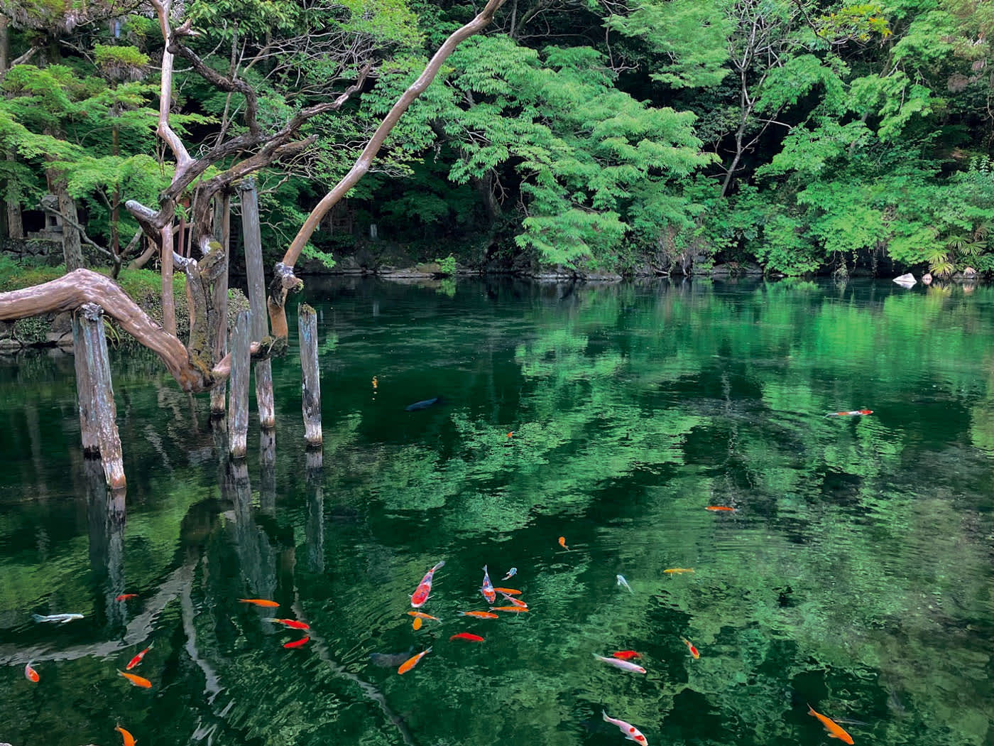 Izuruhara Benten Pond, the pristine source of the Izuru River, is a designated Prefectural Natural Treasure. It offers a picturesque and tranquil setting where koi fish gracefully swim in crystal-clear waters among the plants.