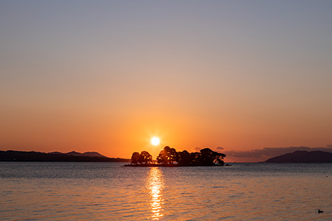 Lake Shinji, which is on the list of famous scenic sites in Japan known as Nihon Hyakkei (“The 100 Landscapes of Japan”), can be viewed while traveling along the Taisha Line of the Ichibata Electric Railway in Shimane Prefecture.