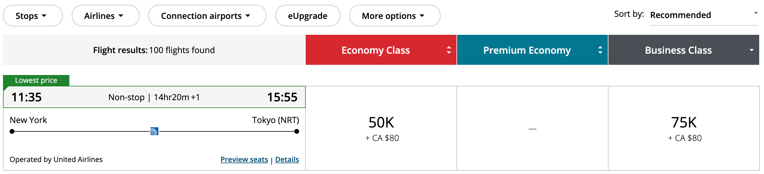 You can get a better deal on business-class tickets if you book United flights to Tokyo with Air Canada Aeroplan. This program has a distance-based award chart, so pricing varies based on the length of your flight. However, a one-way flight from EWR to NRT costs just 50,000 points in economy and 75,000 points in business class plus 80 Canadian dollars ($56) departing the U.S. and just over $100 departing Japan. You can transfer Amex, Bilt, Capital One and Chase points to Aeroplan.