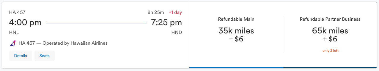 If you want to save yourself a step, you can transfer American Express points to Hawaiian and then just book an award directly through the airline’s own HawaiianMiles program. The new SEA-NRT route, which starts in May 2025, requires at least 34,300 miles each way in economy (it’s usually 40,000 to 50,000 miles) or 95,000 miles in business class, though award availability is tight, and some days require as many as 250,000 miles each way.