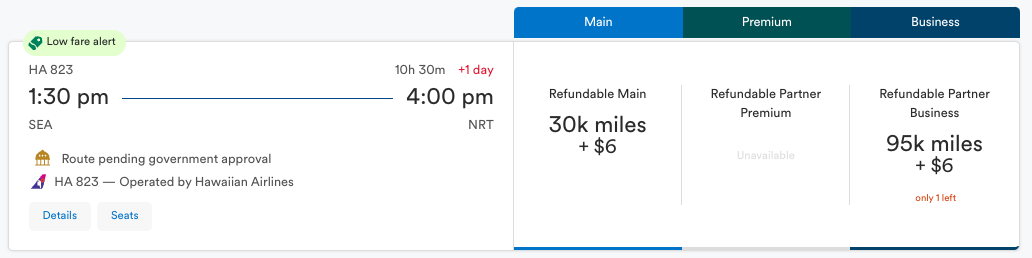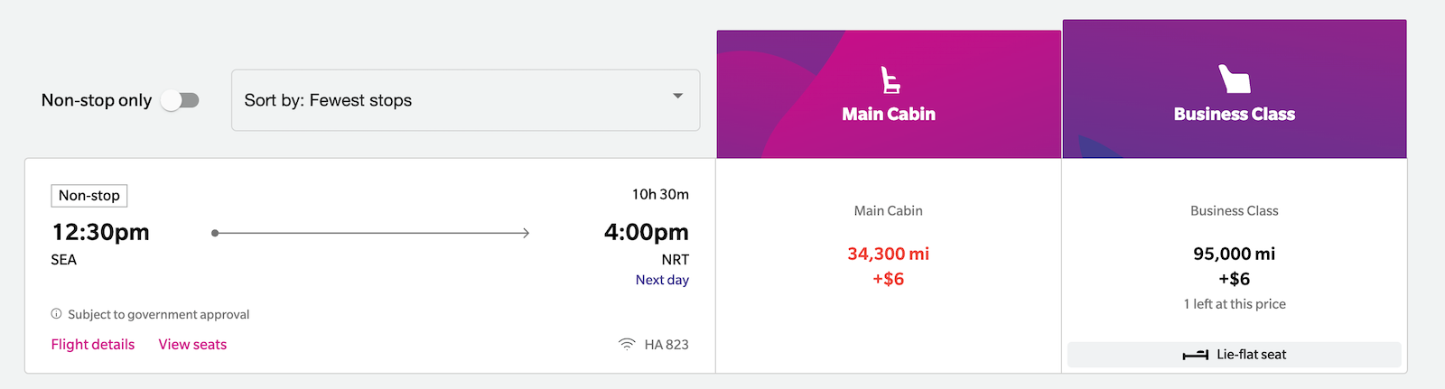 Alaska prices Hawaiian flights dynamically, and you’ll often see business-class tickets go for over 200,000 miles one-way on all of Hawaiian’s routes. However, we found the upcoming Seattle-Tokyo route for as low as 30,000 miles in economy and 95,000 miles in business class, with taxes and fees of $5.60 to $50 or so depending on the direction of travel.