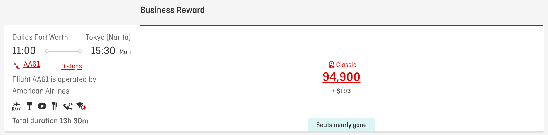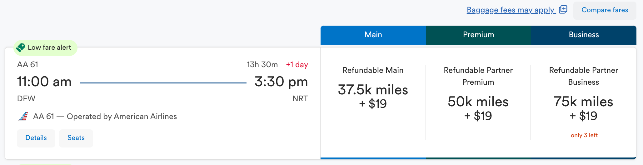 If you want to use Capital One miles, American Express Membership Rewards points or Citi ThankYou Rewards points for your flights, consider booking via Qantas Frequent Flyer, which is a transfer partner of all three programs. You’ll pay 37,600 miles in economy, 71,100 miles in premium economy and 94,900 miles in business class on the DFW-NRT route, which seems to have the most availability. Taxes and fees are higher than when using American or Alaska miles at just under $200 each way.