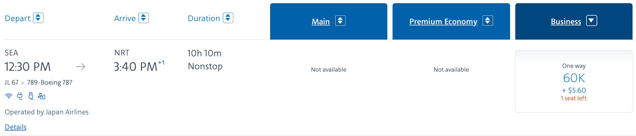 Unfortunately, Delta rarely offers partner-bookable award space on international flights to Asia, so this is often your only option for flying Delta to Japan. However, you can lower your mileage cost if you have an eligible Delta cobranded credit card with Delta’s TakeOff 15 benefit, which offers a 15% discount on award tickets. If you’re a Delta elite with a Global Upgrade Certificate, you might consider booking Main Cabin or Premium Select and applying an upgrade.