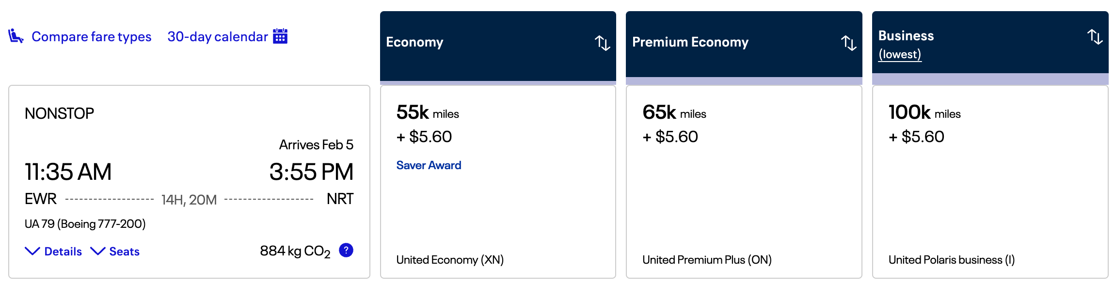 United MileagePlus prices awards dynamically, but you can often find economy flights from 50,000 miles, premium economy flights for 60,000 miles and business-class flights for 100,000 miles each way, all with minimal taxes and fees of under $6 from the U.S. and around $50 departing Japan. Prices could be higher or lower depending on when you travel. You can transfer Chase Ultimate Rewards and Bilt Rewards points to United.