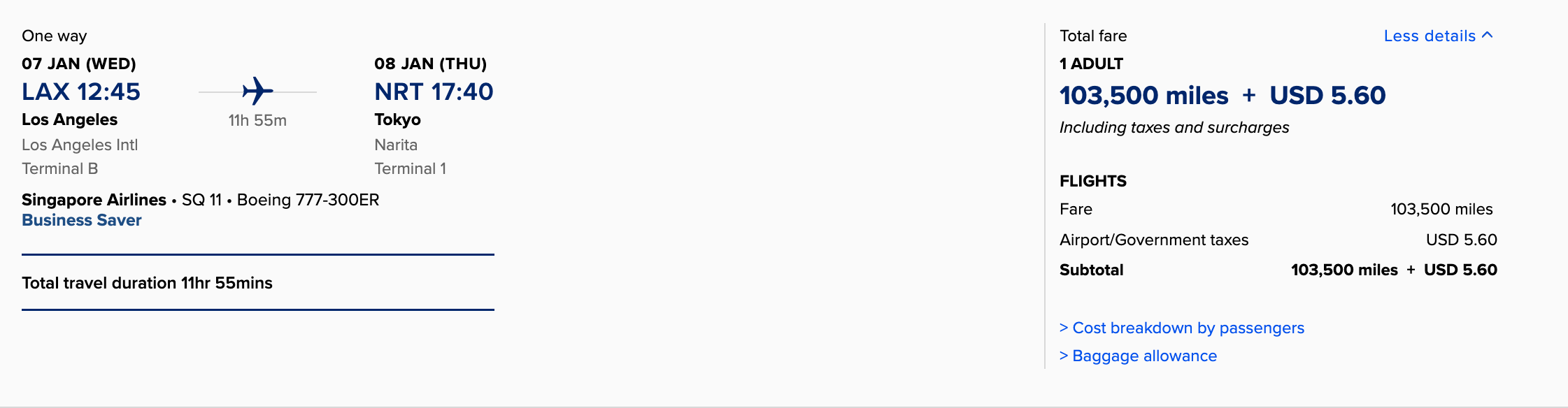 You’ll pay 38,500, 73,000, 103,500 or 120,500 Singapore miles for economy, premium economy, business-class or first-class awards, respectively, plus taxes and fees of around $5.60 to $50 depending on the direction of travel. This pricing is for Saver rewards, which are cheaper than booking Singapore’s Advantage rewards.