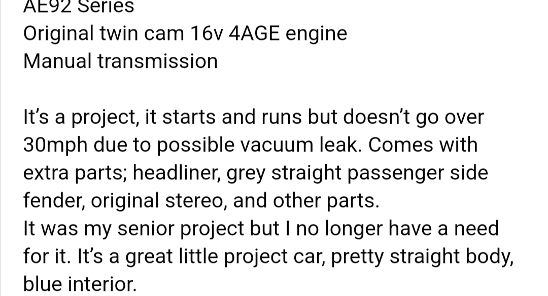 They want 1500 for a 1989 coupe, Inside isn't too bad with some minor defects, outside looks great haven't seen under the car for rust tho. The engine looks really clean aswell but sounds kinda rough? Idk it sounds like there might be a clog. Any info/guesses would be great! Just trynna see if I should get it, I don't mind building it up. But is 1500 a good deal?