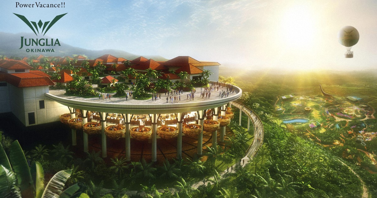 Junglia Okinawa, built in the village of Nakijin in the northern part of Okinawa’s main island, will offer 22 attractions, including a balloon ride for a panoramic view of the surrounding jungle area. Visitors can also hop on a vehicle to explore the jungle and simulate the experience of fleeing from pursuing dinosaurs, its operator Japan Entertainment said.