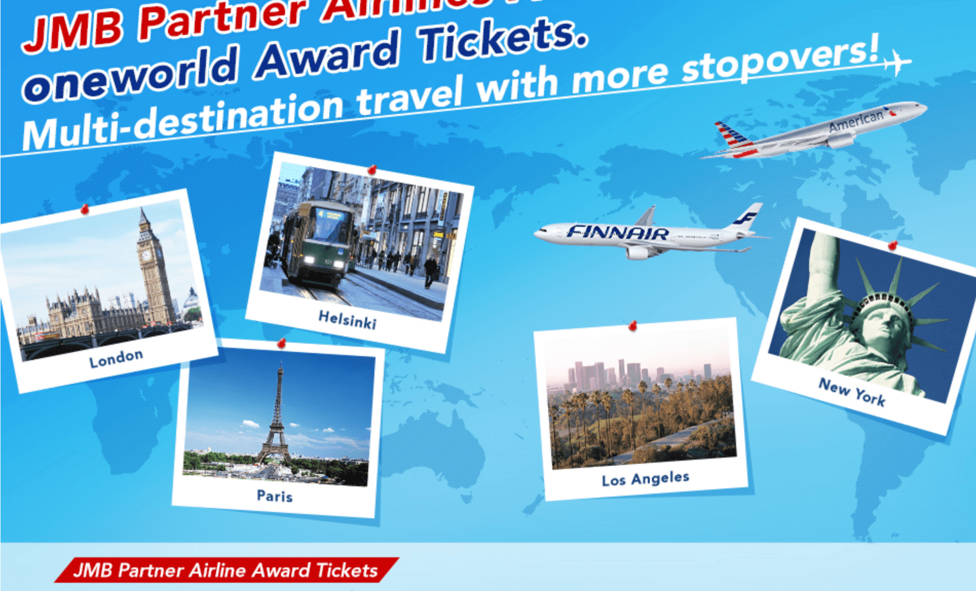 With a JMB Partner Airline Award you’re limited to one partner airline, but you can make three complimentary stopovers on the way to or from your destination. Here is an example from the JMB website: London to Paris to Helsinki to Los Angeles to New York.