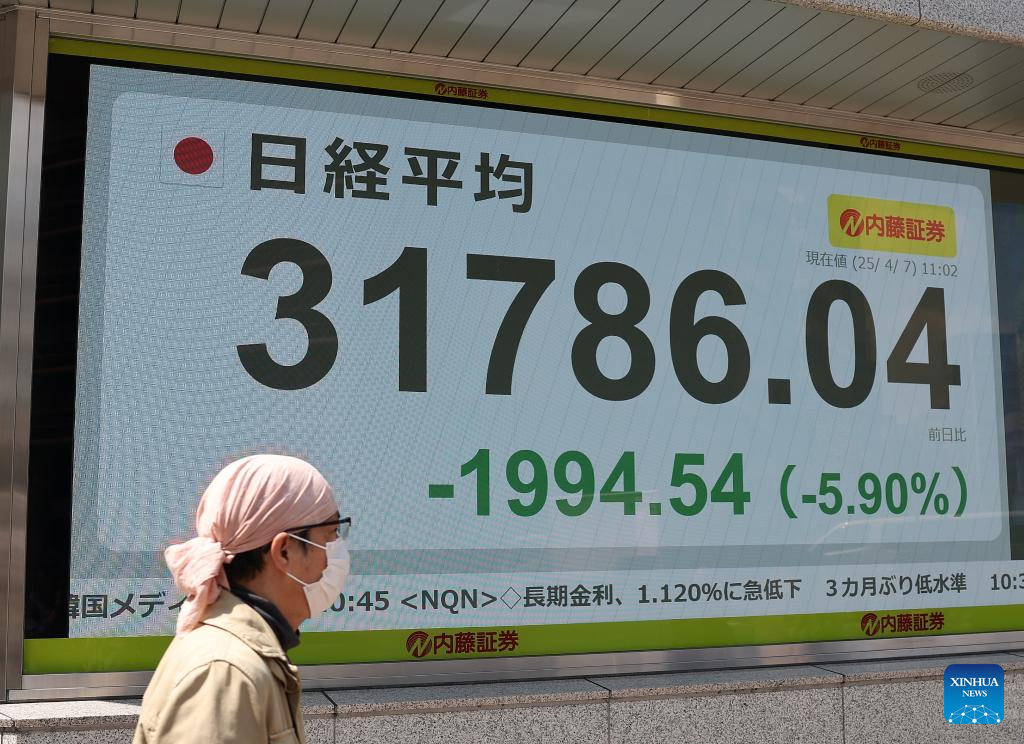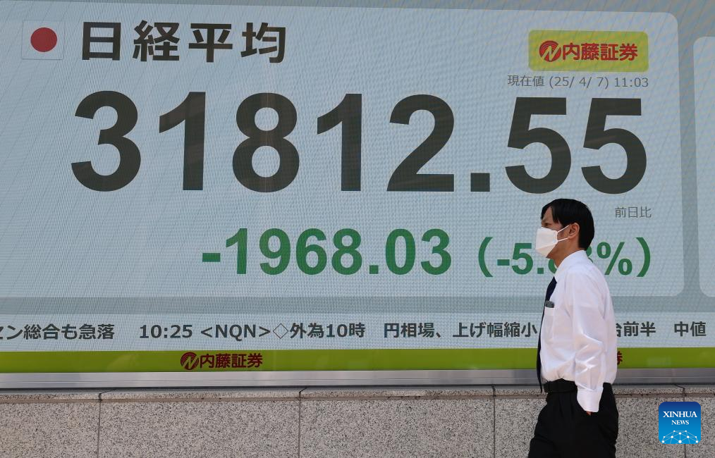 TOKYO, April 7 (Xinhua) — Tokyo stocks plunged Monday, with the benchmark Nikkei index suffering its third-largest point drop on record, as global sell-offs continued amid intensifying fears of an all-out trade war and a global economic recession triggered by the U.S. tariffs hike.