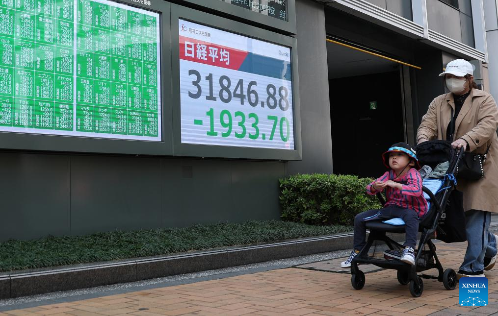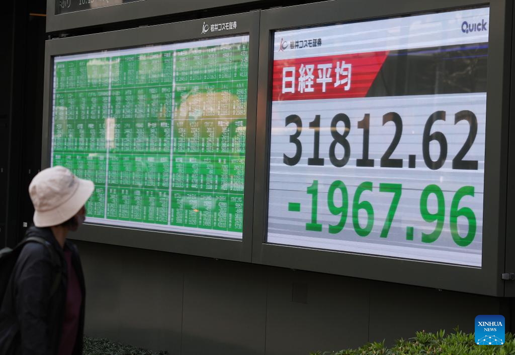 In the first 15 minutes of trading, Japan’s benchmark Nikkei stock index, the 225-issue Nikkei Stock Average, shed 2,843.48 points, or 8.42 percent, from Friday to 30,937.10, the lowest intraday level since October 2023. (Xinhua/Jia Haocheng)