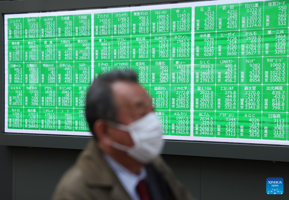 A pedestrian passes a screen showing stock market information in Tokyo, Japan, April 7, 2025. Tokyo stocks plunged early Monday with the benchmark Nikkei index briefly losing nearly 3,000 points amid growing fears of a global trade conflict triggered by U.S. tariffs. In the first 15 minutes of trading, Japan’s benchmark Nikkei stock index, the 225-issue Nikkei Stock Average, shed 2,843.48 points, or 8.42 percent, from Friday to 30,937.10, the lowest intraday level since October 2023. (Xinhua/Jia Haocheng)