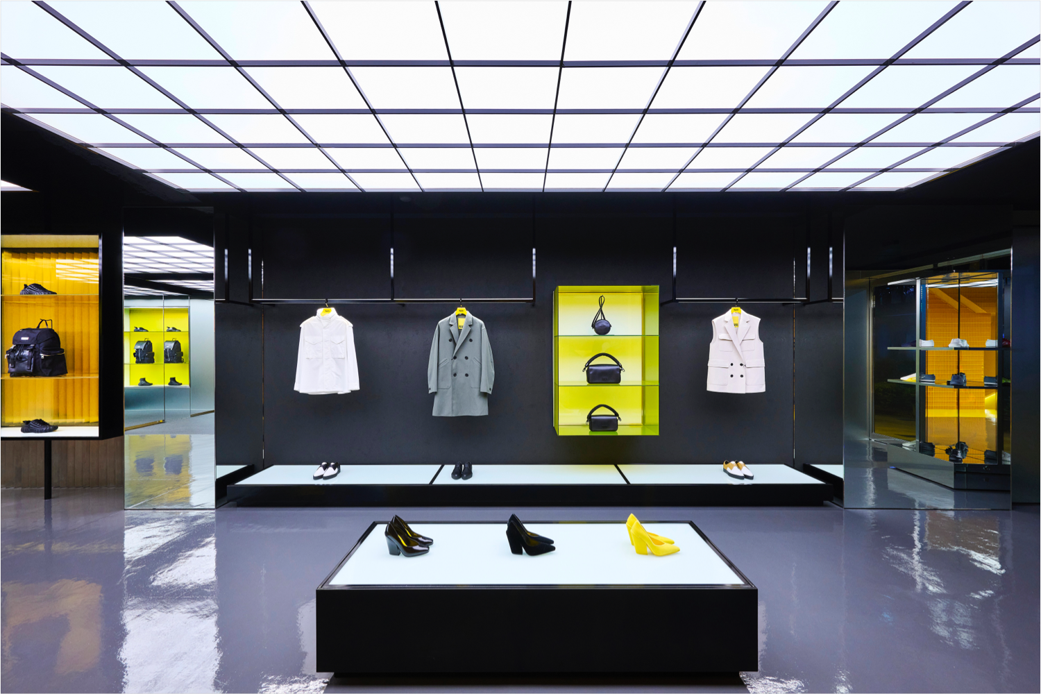 The basement section and first two floors showcase Onitsuka Tiger‘s collections presented at Milan Fashion Week‘s latest edition, in addition to its DENIVITA denim collection. Here, vibrant yellow expresses the active spirit of the brand, while the contrasting dark accents on the floors and walls frame the setting in a sophisticated manner.