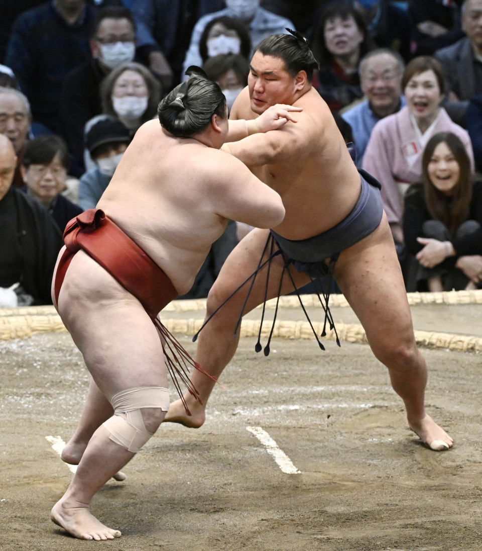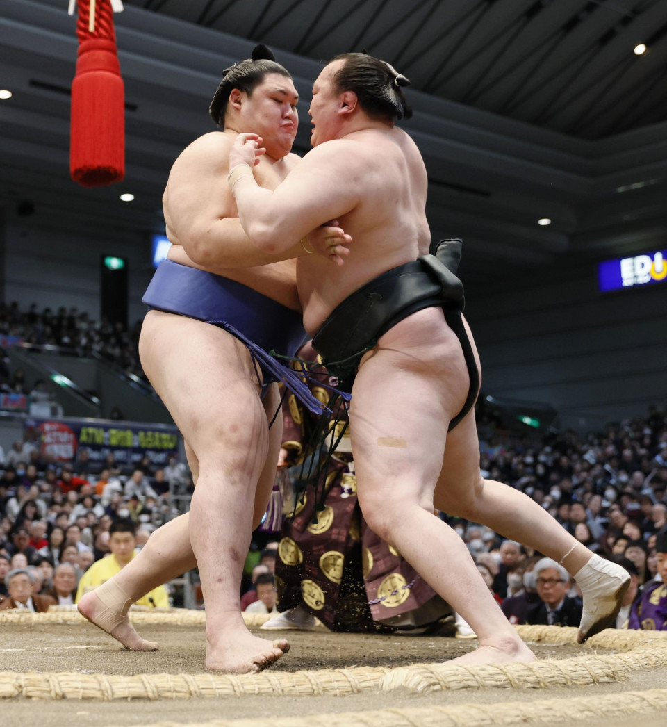 No. 4 maegashira Takayasu held onto his share of the lead by pushing out No. 1 maegashira Wakatakakage (2-5). The 35-year-old former ozeki will next face Hoshoryu, who he has beaten nine times out of their 11 top-division meetings.