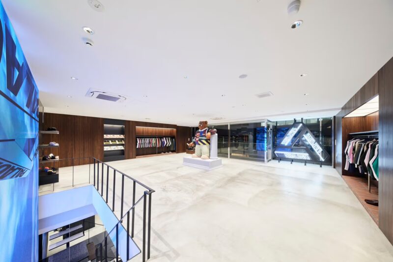 Of particular interest are the bold P-shaped fixtures found throughout the store. These architectural structures, rendered in the same sleek white concrete as the flooring, serve both as installations and functional display units. They offer an avant-garde twist to traditional shelving, echoing Palace’s rebellious ethos while remaining rooted in the spatial harmony of Japanese design.