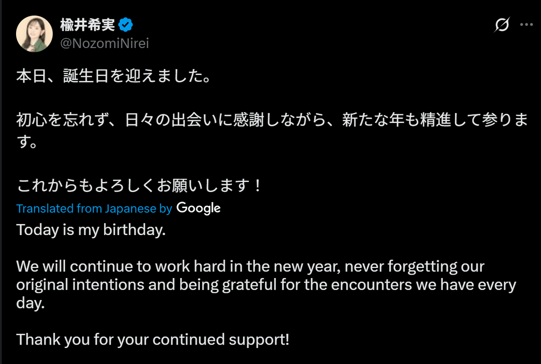 Happy 24th Birthday to Nirei Nozomi female voice actorsseiyuuvoice actorsvoice actresses 1 Comment inspyral 7 months ago Sources:[https://x.com/NozomiNirei/status/1924856690471747773](https://x.com/NozomiNirei/status/1924856690471747773)[https://x.com/NozomiNirei/status/1924846341710348582](https://x.com/NozomiNirei/status/1924846341710348582)[https://x.com/NozomiNirei/status/1924863706074386654](https://x.com/NozomiNirei/status/1924863706074386654)