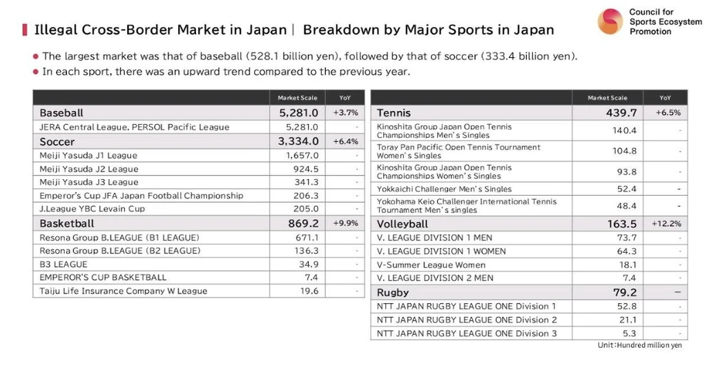 Of all wagers, domestic baseball led the way with a 2024 handle of ¥528.1 billion, according to the CSEP report. The amount dwarfed soccer, the next highest at ¥333.4 billion, and basketball with ¥86.9 billion. Tennis ranked fourth, followed by a pair of niche sports in volleyball and rugby.