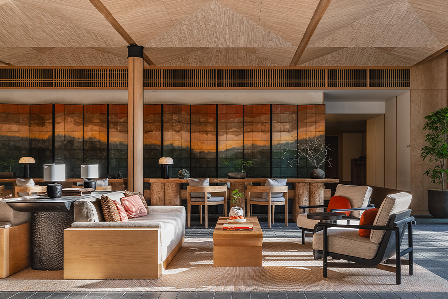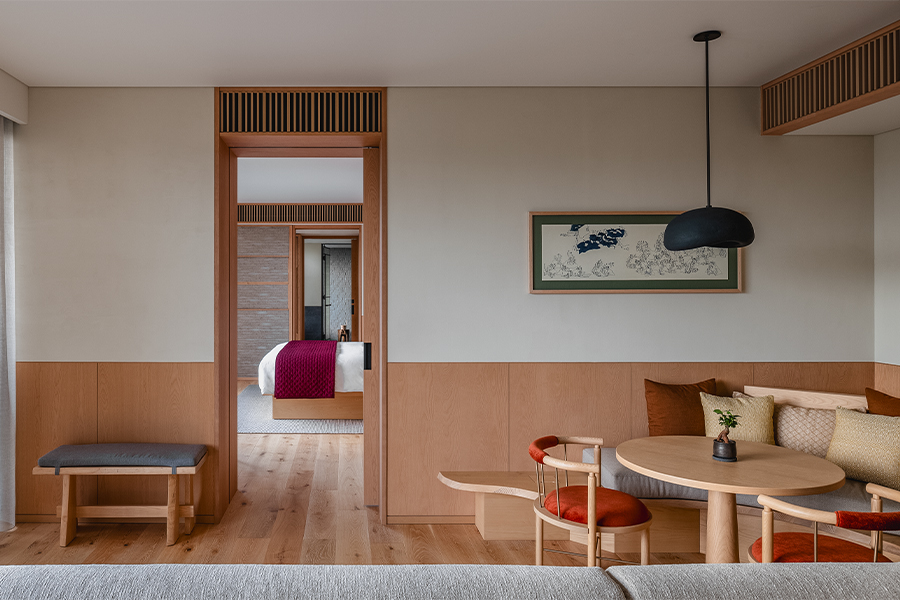 This transporting aura continues in the guestrooms, where sconces are reminiscent of handcarved wooden plates and headboards comprise panels that flip between red lacquer and geometric Asanoha motifs.
