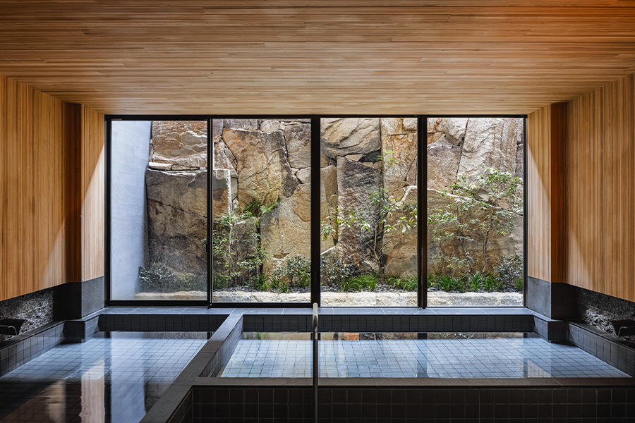 The spa’s hot baths, reminiscent of an onsen, are elevated by scenic views