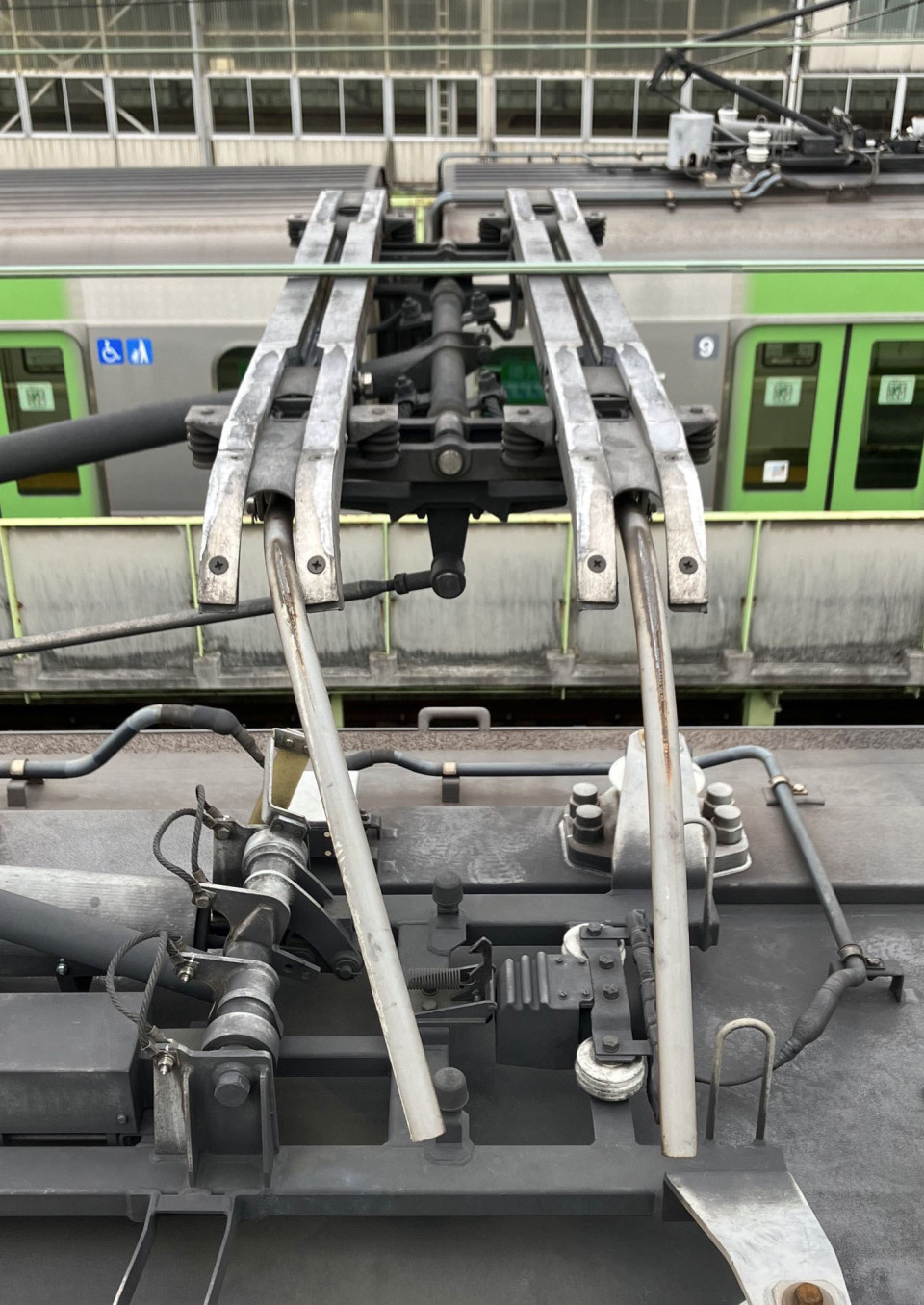 Photo taken on the morning of May 23, 2025, shows damage (front L) to a pantograph from a JR Yamanote Line train. (Photo courtesy of JR East)(Kyodo) ==Kyodo