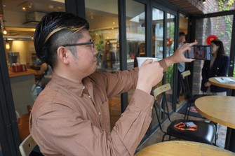 A participant in an event aimed at helping middle-aged men take better profile photos snaps a selfie while holding a white cup in Tokyo’s Shibuya Ward on May 31, 2025. (Mainichi/Tsuyoshi Goto)
