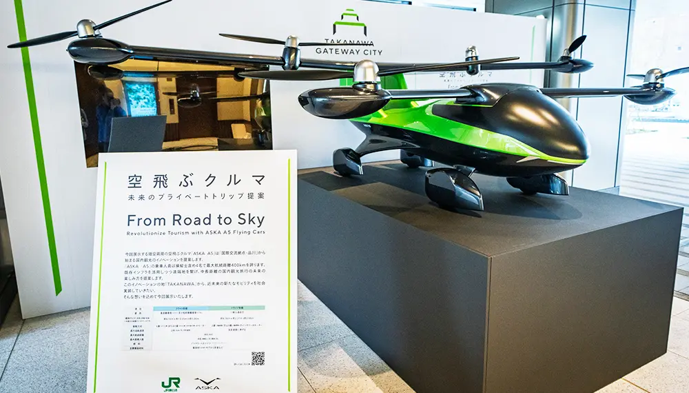 A mock-up of a flying car is displayed outside the Travel Service Center. A video provides information about this next-generation vehicle. The helicopter-like flying cars are being considered as a future travel service, with plans to implement them in 2028.
