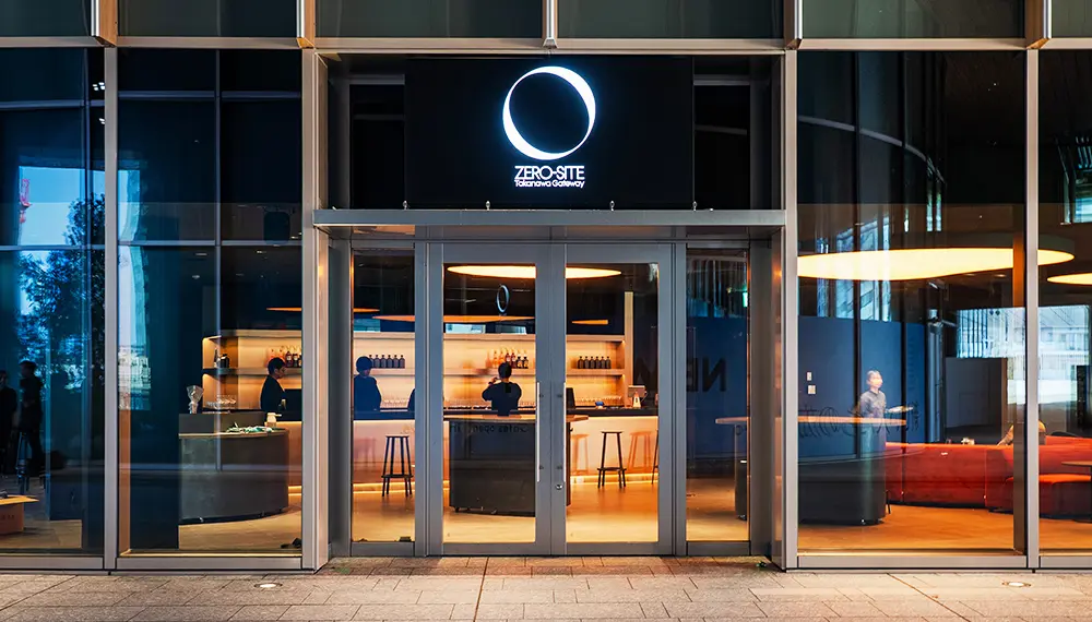 Zero-Site Takanawa Gateway is a bar with a focus on high-quality service and sustainability. The space features kinetic art installations and hosts events featuring art, fashion, design, and more. The art installations include lamps and light displays that light up at night, forming a sort of nighttime art museum. Customers can look at these displays while enjoying ethically sourced beverages and food.