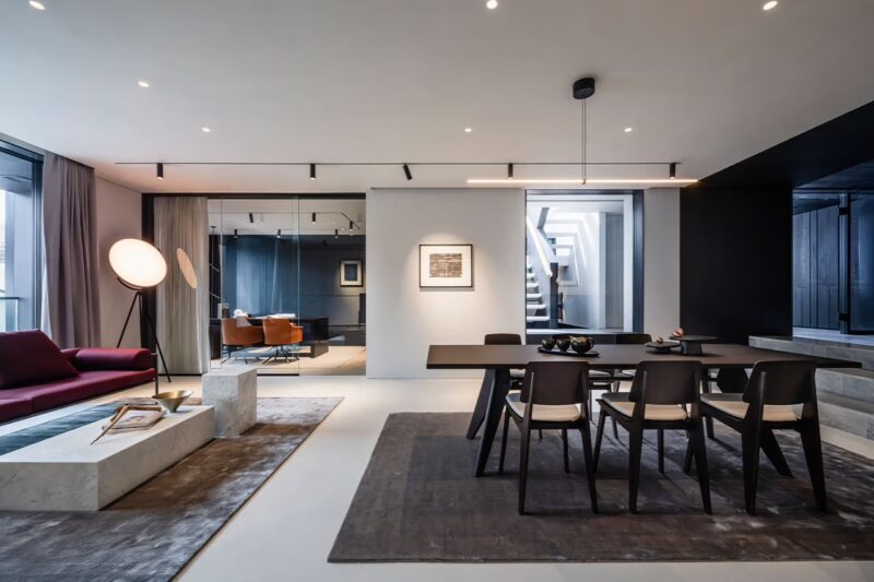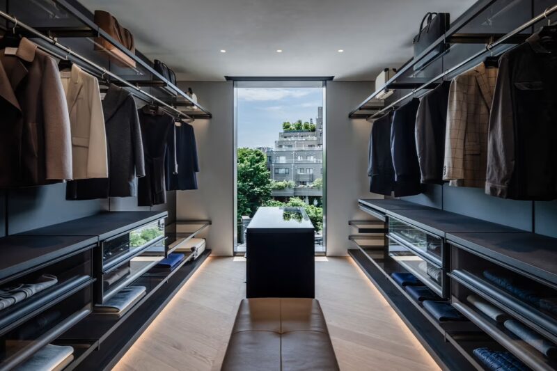 Located in one of Tokyo’s most sophisticated and architecturally rich neighborhoods, the residence spans 724 square meters (7,793 square feet) and offers a spatial narrative as striking as any Aston Martin sports car. The architectural center of gravity lies in the sculptural steel staircase that spirals dramatically between floors—a literal and symbolic anchor of movement and design flow.