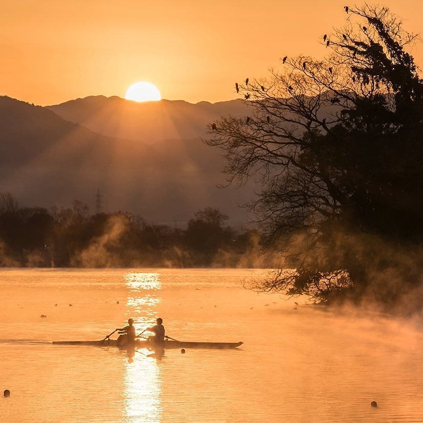 The fog quickly disperses, as the sun rises over Lake Ezu. The birds at roost break the silence and a boat glides over the still water in the morning glow. Lake Ezu is a part of Suizenji Ezuko Park, a superb oasis located 5 km (3 miles) southeast of downtown Kumamoto.