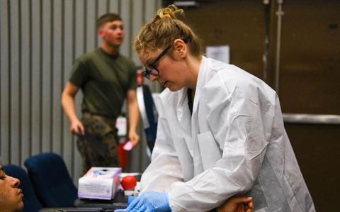 Red Cross volunteer Mrs. Kirsten Moore prepares a service member for blood donation during a drive at Camp Foster, Okinawa, July 2025.