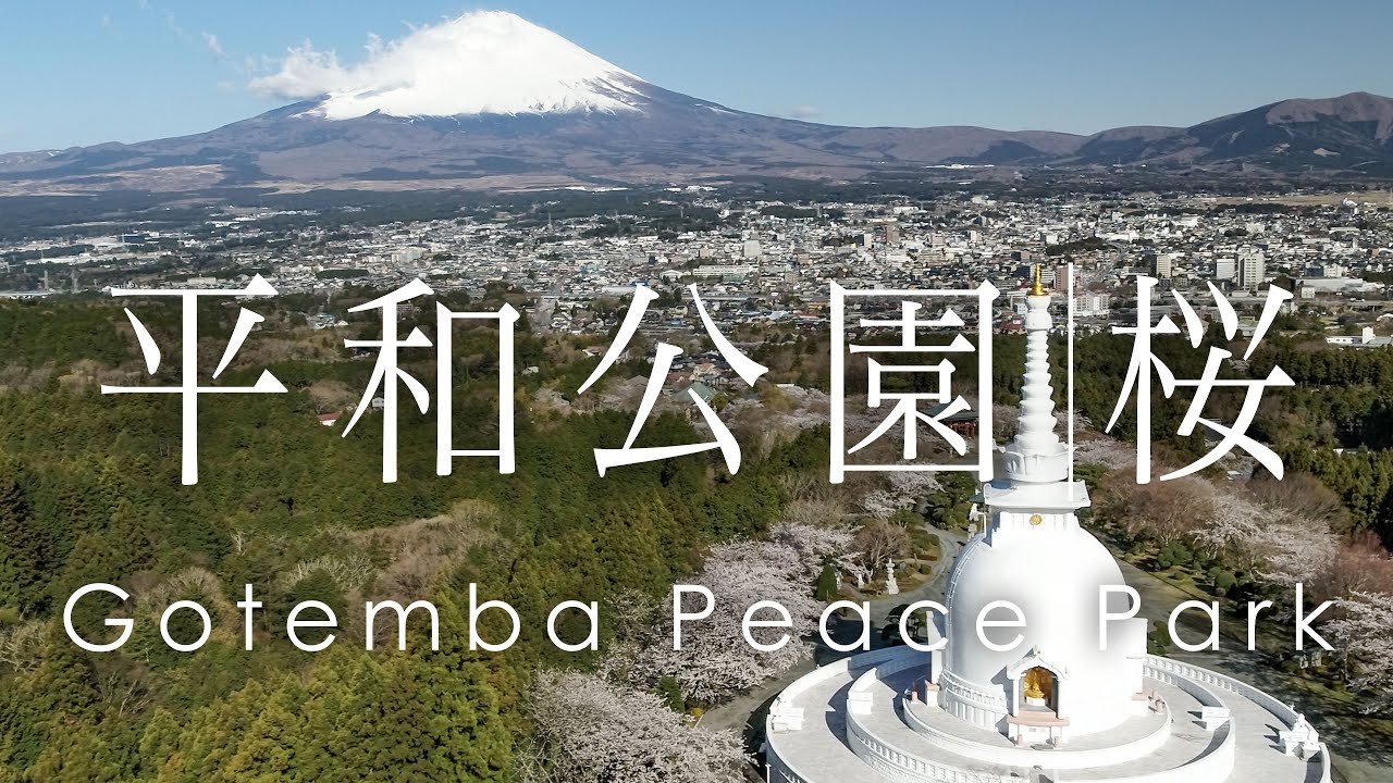 ドローンで空撮 御殿場平和公園の仏舎利塔からみた桜と富士山。
