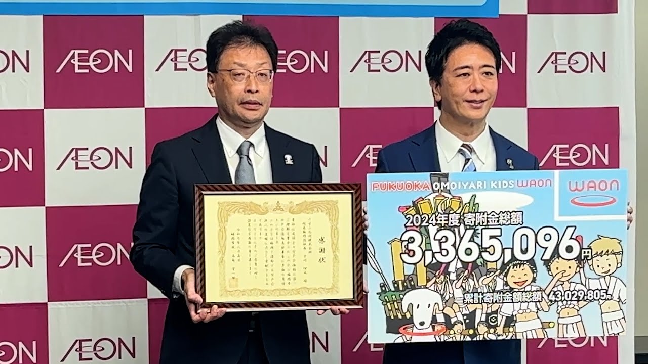 ただ今から福岡市NPO活動支援基金寄付 金増定式を行います。この度の寄付につき ましては、異音株式会社様と果市との間で 締結した地域共同事業に関する高括連携 協定に基づく事業として全国の和音加盟点 で利用できる電子マネ 思いやりキッズ和音のご利用額の一部を 給勤としていただいており 法人アジア太平洋会議委員福岡やえ子供の 健全育成を図る活動へ活用させていただて おります。今回イオン九州様から 336万5096円 のご寄付をいただき、2011年からの 寄付額の合計は4302万9805 円と長年にわってNPO法人の活動にご 支援をいただいております。え、それでは 九州株式会社中川社長よりご挨拶を頂戴 いたします。どうぞお願いいたします。 はい。え、本日お時間いただきまして ありがとうございます。え、2011年 ですね、え、この12月にあの、え、福岡 市と、え、ま、地域共同のですね、 まして、え、この和につきましてもですね 、え、その時から発行しております。で、 あの、お様ですね、え、かなりマスが取れ ておりまして、今、あの、ま、 プラスチックの、え、和音でございますが 、ま、時代の流れとです、今、あの、 スマホに搭載した、え、デジタルワに、え 、しておりまして、そちらの拡大です。 また、あの、これもですね、しっかり、 あの、地域公献の中で、え、お客様へご 投地ワが、え、福岡市に0.1%寄付さ れるということにつきまして、また店舗を 止めましてですね、え、お知らせしてです ね、さらに拡大をしていきたいと思って おります。また、あの、深様とはですね、 普段から、え、コミュニケーションさせて いただきまして、え、ま、あの、ラブ アースというとね、今年ですね、海岸の 戦争私もで参加したいですね。また、あの 、配布の回収等につきましても非常にあの 店舗ではでございまして、今あの4店舗 まで拡大して拡大すると申してますので、 え、今後につきましても、え、福岡市並び に九州についてしていきたいと思いますの で、色々コミュニケーションさせて いただいて、え、福岡を取り組みですね、 しっかり、え、フォールしていただいた方 ということもよろしくお願いいたします。 ありがとうございます。ありがとうござい ます。ありがとうございます。 ありがとうございました。 え、続きまして市長の高島よりご挨拶を申します。 はい。え、中社長、そして幼の皆さんには本当にあのありがとうございます。 え、たくさんの 市民がですね、からあのイオでお買い物さ せていただいているわけですけども、その 0.1%ですね、あの和をを通して、え、 こちらのアルピオ活動にあのご支援を いただいてそれが、え、長く長くこう 積み重ですね、国までなると、あの、本当 にこう大きなご支援を継続的にして いただいているということに、あの、 改めて感謝を申し上げたいと思い存じます 。あの、実際頂いたあのでですね、あの、 アジア太陽都市サミットもあのたくさんの 子供たちを経入れそしてまたあの海外、え 、実際にあの出すということできており ますし、またあの日頃からそもそも世の皆 さんにはですね、ま、先日の参議院選挙も そうですが、あの投票場としてですね、 これ非常にあの大きなお力をいただいて おりまして、記日前投票も本当におかげ様 でどんどん試合が伸びておりまして、今 も是非あのよろしくお願い できればと思っておりますし、先ほどの あの俳優の回収などの話もありましたけど 、やはりあの多くの市民があの行きやすい 場所という中でそういう社会貢献をして いただけると本当にあの行政としてもあの 助かりますしあのこれからもいろんな形で の協議をですねお願いしたいと思います。 こちら