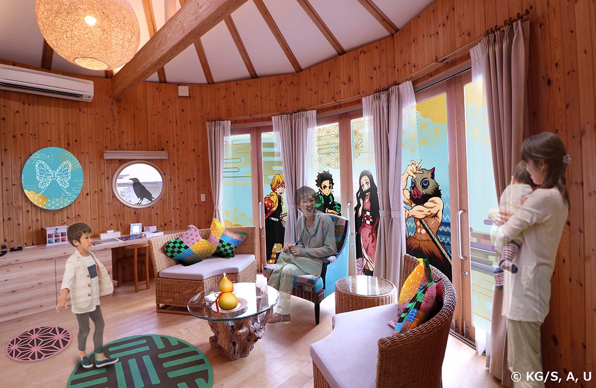 For a limited time only, from March 2025th (Sat) to December 3th (Sun), 15, two special collaboration rooms between Nijigen no Mori and the anime “Demon Slayer: Kimetsu no Yaiba” will be available! “Kizuna no Cocoon” is a space where you can experience the journey and bonds that the four characters, including Kamado Tanjiro, have woven, based on the concept of “A tale of bonds that travels around.” The room features a living room designed with a butterfly mansion motif and a bedroom with a wisteria flower crest motif. Up to three people can stay in this room.