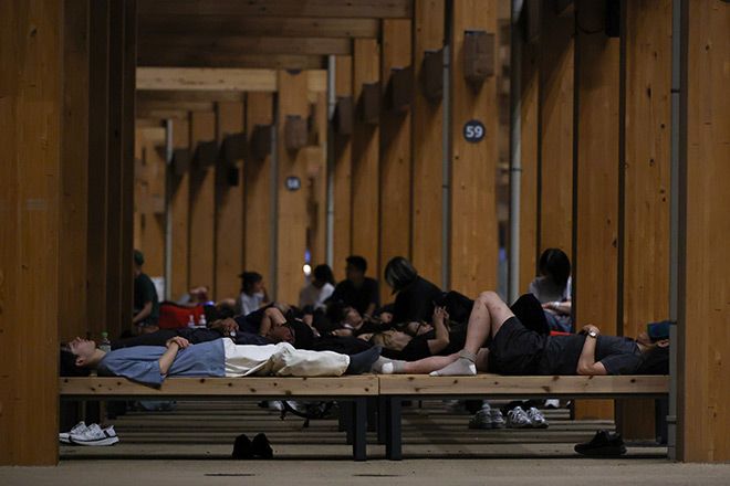 At the expo site, the Osaka Healthcare Pavilion decided to open its doors for the night, and people lined up to spend the night inside.