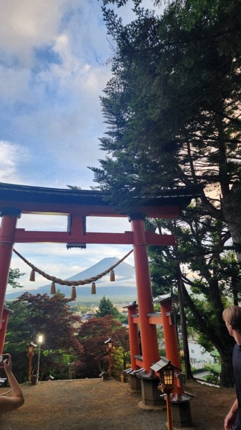Mount Fuji is seen through a torii gate in the Lake Kawaguchi area. The photo was taken when the writer was with friends near the end of her study abroad journey.