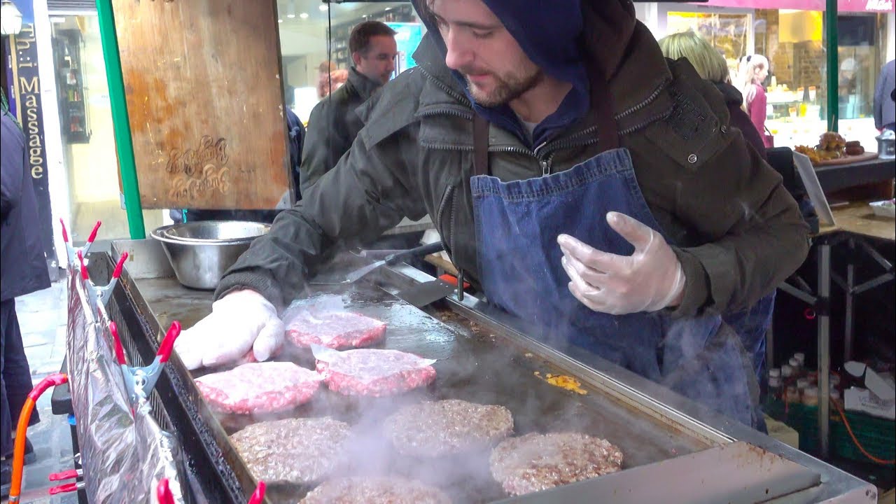 Huge Burgers Covered with Melted Cheese and Sauces. London Street Food, Soho
