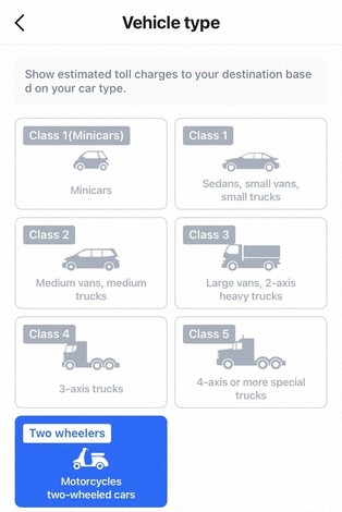 This “Naver Map” app screenshot shows the vehicle types to choose from. (Mainichi)