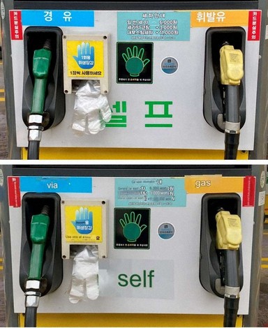 These two images show a pump at a gas station in Seoul, top, and a screenshot on the Google Translation app. “Diesel” is somehow translated as “via,” but at least the app tells users which side is gasoline. (Mainichi/Tatsuma Kasama)