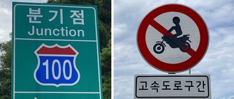 A national expressway sign, left, and a “no motorcycles” sign are seen in South Korea, July 31, 2025. (Mainichi/Tatsuma Kasama)