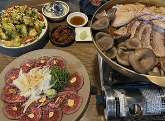 A hot pot dish of pork, mushroom and bean sprout in spicy soup, right, shrimp salad and roast beef are seen at the Jugwan restaurant in Seoul’s Itaewon area, Aug. 2, 2025. (Photo by the author’s friend Sod Erdene)