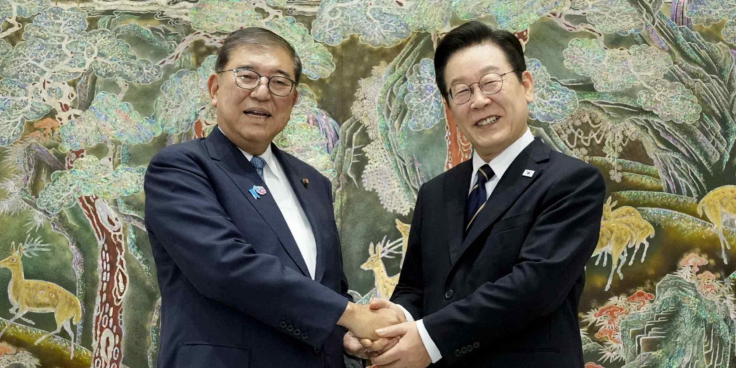 Japanese Prime Minister Shigeru Ishiba, left, shakes hands with South Korean President Lee Jae Myung upon arrival at the summit venue in Busan, South Korea, on Sept. 30. © Kyodo