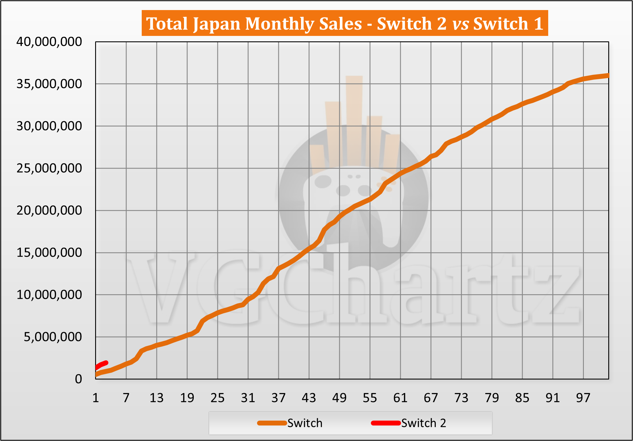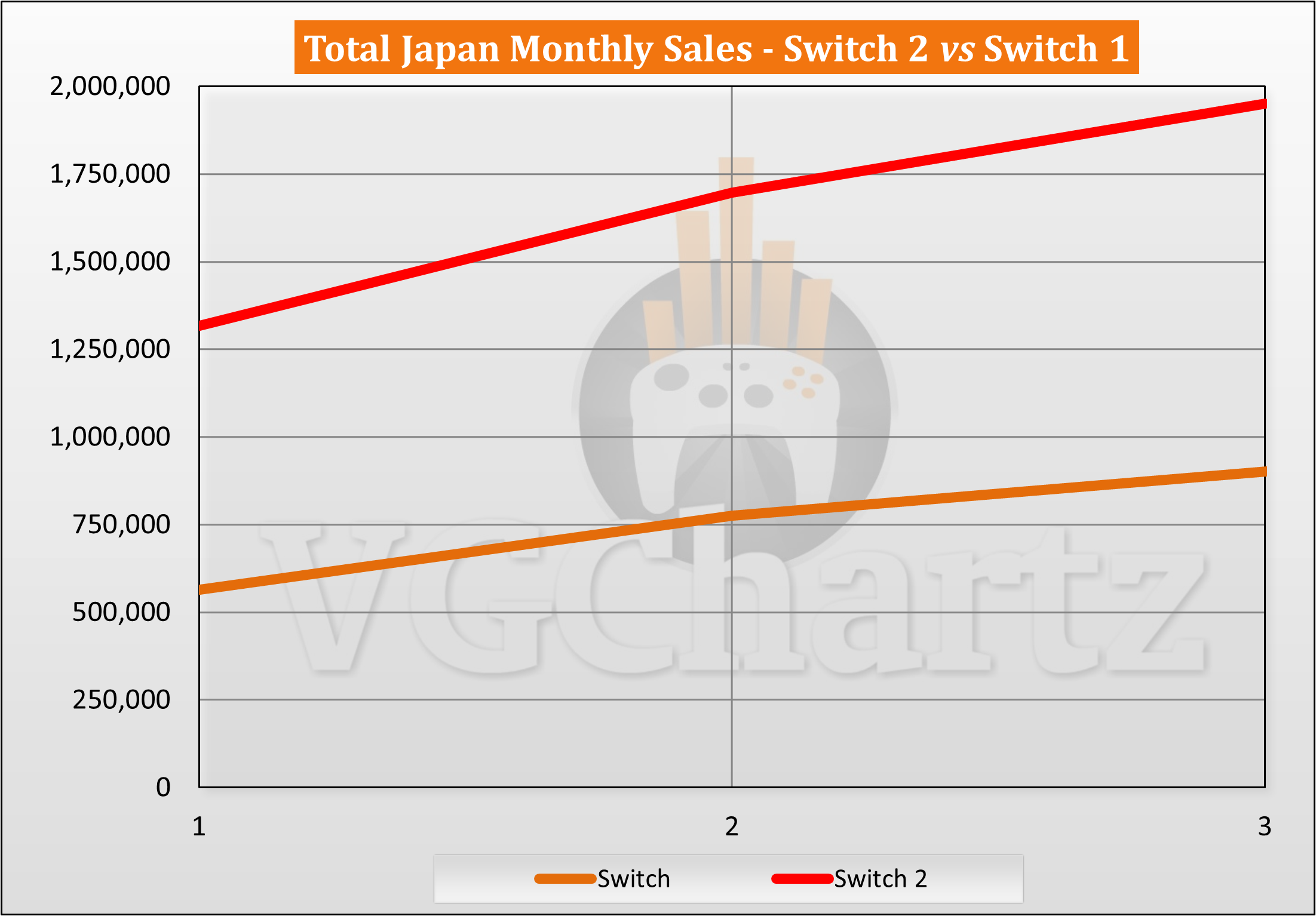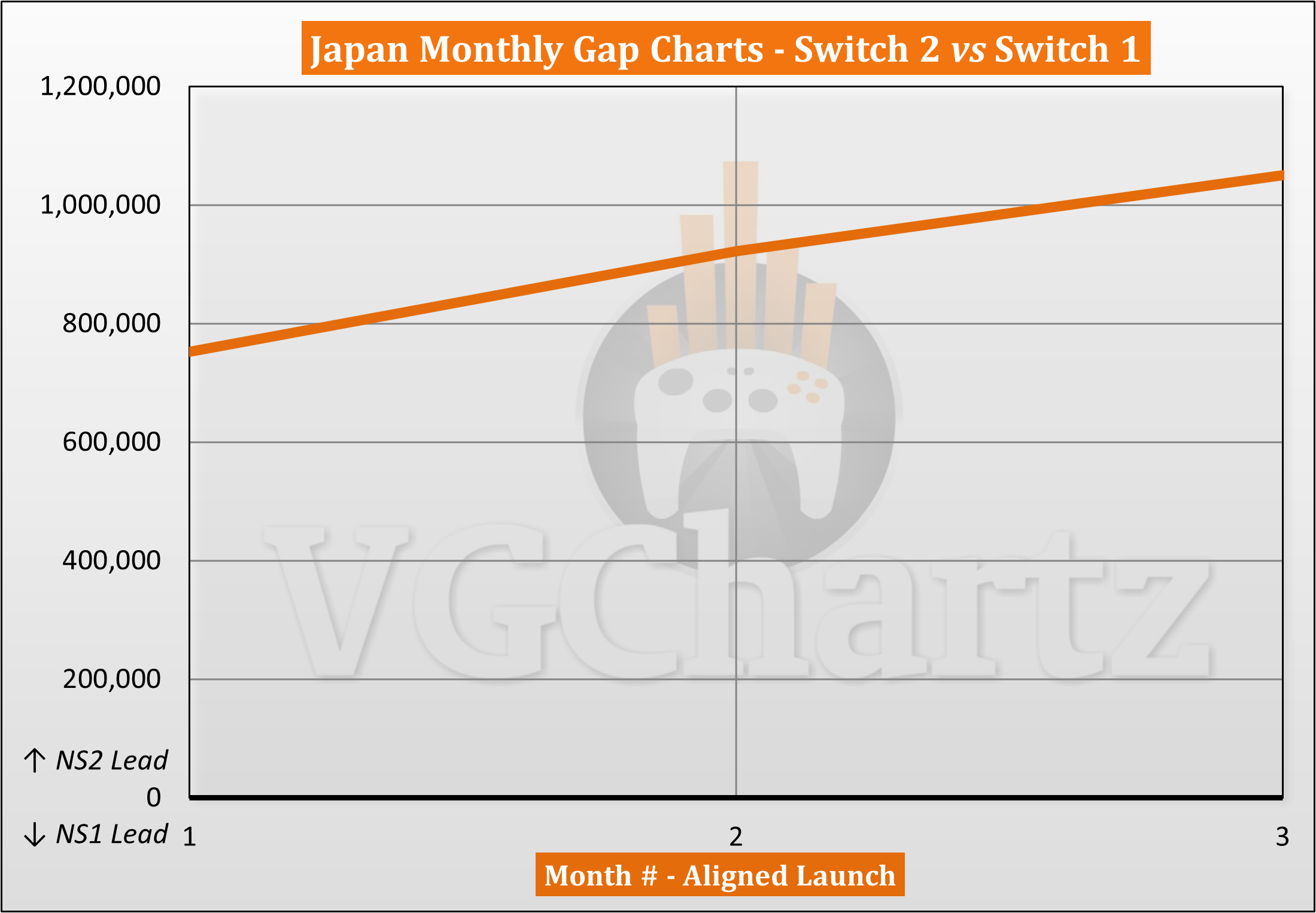 This monthly series compares the aligned Japanese sales of the Nintendo Switch 2 and Nintendo Switch 1.