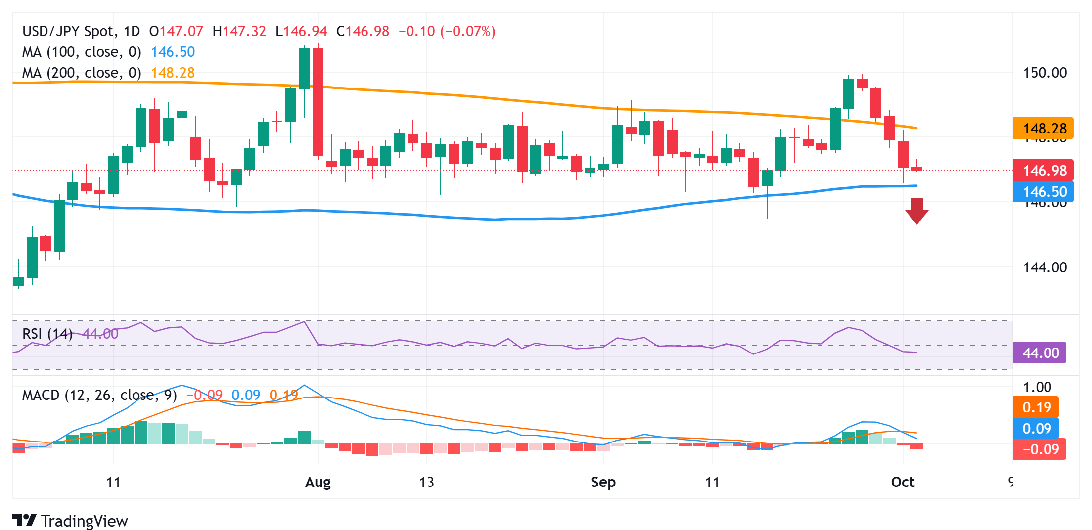 Meanwhile, the market reaction to the US government shutdown, so far, has been muted amid expectations of a limited impact on the economy. This remains supportive of a generally positive risk tone, which, in turn, might keep a lid on the safe-haven JPY. The US Dollar (USD), on the other hand, struggles to capitalize on the overnight bounce from a one-week low amid dovish Fed expectations. This, in turn, attracts fresh sellers around the USD/JPY pair following the Asian session uptick to the 147.25-147.30 region.