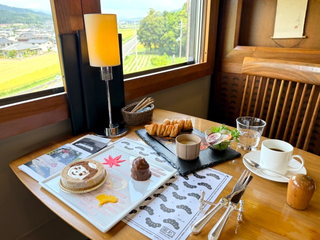 The Morning Course, served on the Fukuchiyama to Amanohashidate route, features a special “Oeyama Shuten Taiji Plate” (“Oeyama Demon-Slaying Plate“), which references the famous Japanese legend of Shuten-doji, the demon of Mt Oe in Kyoto folklore. Produced by Patisserie Cafe Katashima, a local cafe established in 1970 that uses ingredients from the region, the demon-slaying plate includes items like “Demon’s Club Pie Cornet”, a pastry shaped like the spiked club traditionally held by demons, and “Demon Hag and Jerusalem Artichoke Potage”.