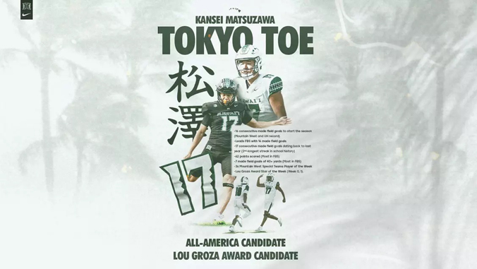 Nicknamed the “Tokyo Toe,” Matsuzawa’s story has become one of the most compelling in college football. A native of Ichikawa, Japan, he grew up playing soccer and didn’t attempt his first kick until age 20 after attending an NFL game in Los Angeles. He taught himself how to kick by studying YouTube videos and eventually earned a spot at Hocking College in Ohio. After two seasons there, he joined the Rainbow Warriors as a walk-on in 2023.