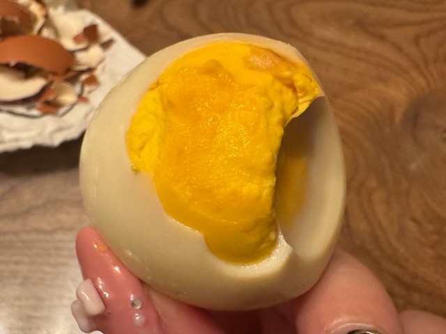 It was a super hard-boiled egg! In fact, it was the most hard-boiled egg she had ever eaten in her life. Other than that, she didn’t really have any strong feelings about it.